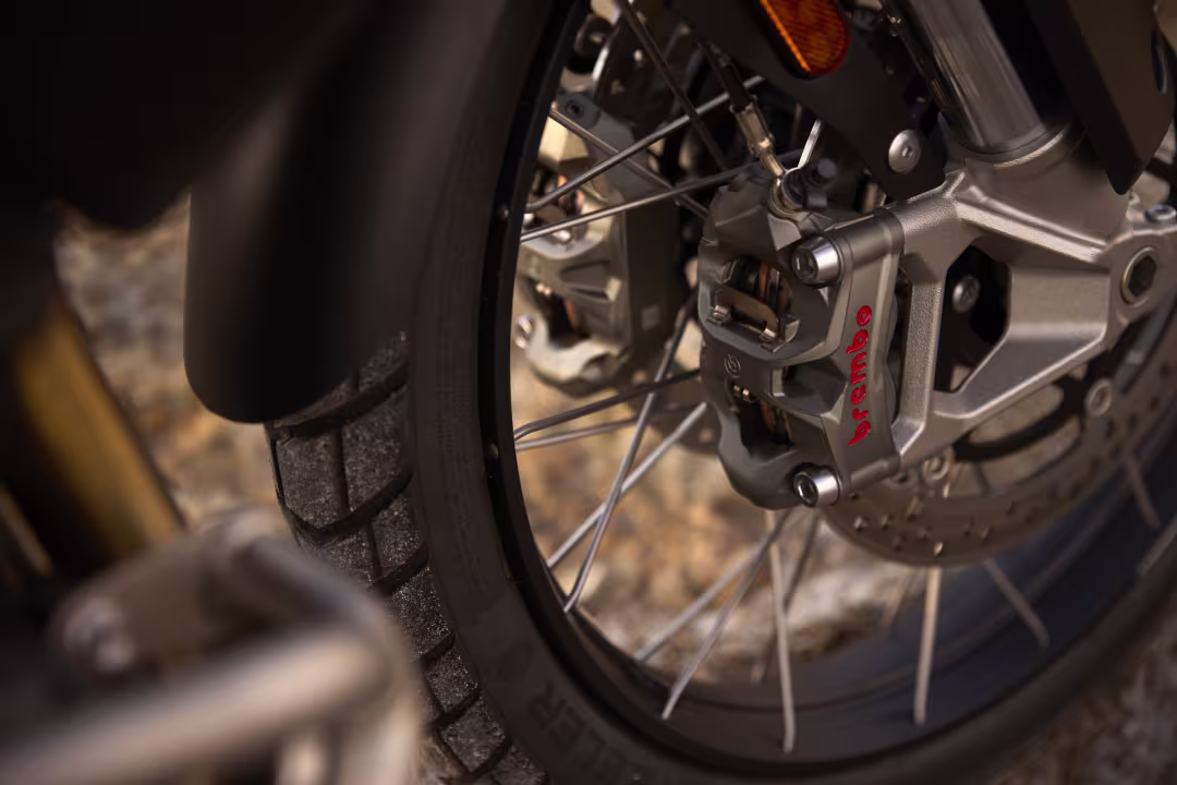 Off-road spec & toughening up: As with Alpine, the 900 Desert gets the Akrapovič silencer. But more importantly, it swaps to spoked, tubeless 21-inch front / 17-inch rear wheels (better for rough terrain) and includes fuel-tank protection bars.